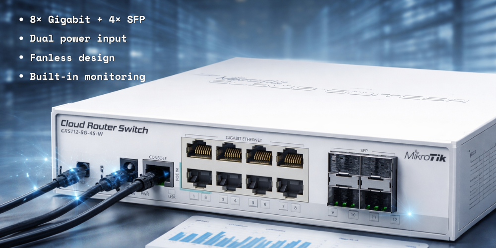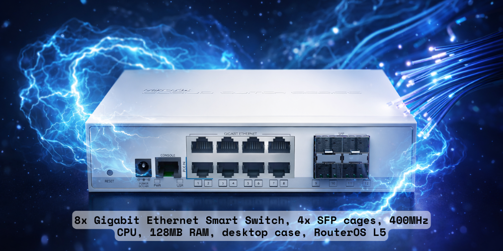 A “small size low cost” member of our CRS series. It comes with eight Gigabit Ethernet ports and four SFP cages.