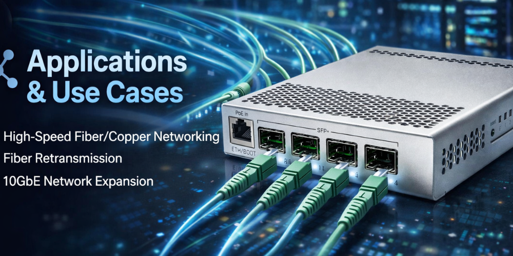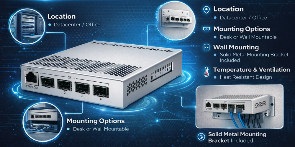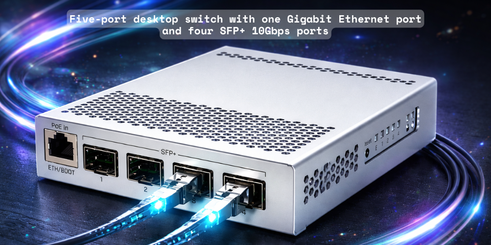 The CRS305 is a compact yet very powerful switch, featuring four SFP+ ports, for up to 10 Gbit per port. The device has a 1 Gbit copper ethernet port for management access or regular traffic forwarding and two DC jacks for power redundancy. The device is a very sleek and compact metallic case without any fans, for silent operation.